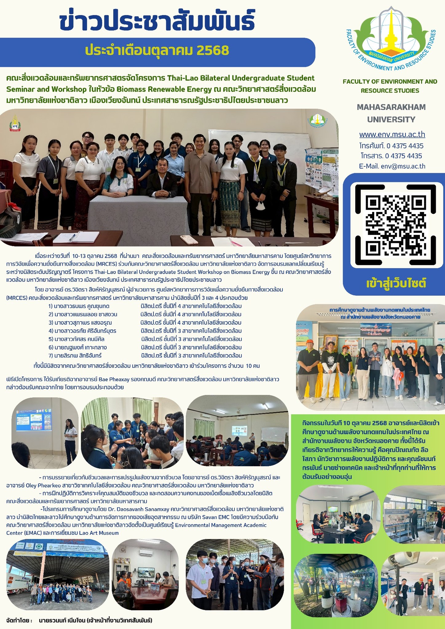 วันนี้ 10 ตุลาคม 2568 เวลา 08.30 – 14.00 น. คณะสิ่งแวดล้อมและทรัพยากรศาสตร์ มหาวิทยาลัยมหาสารคาม ได้จัดกิจกรรมแลกเปลี่ยนเรียนรู้ เรื่อง การเขียนผลลัพธ์การเรียนรู้ระดับรายวิชา (CLOs) …