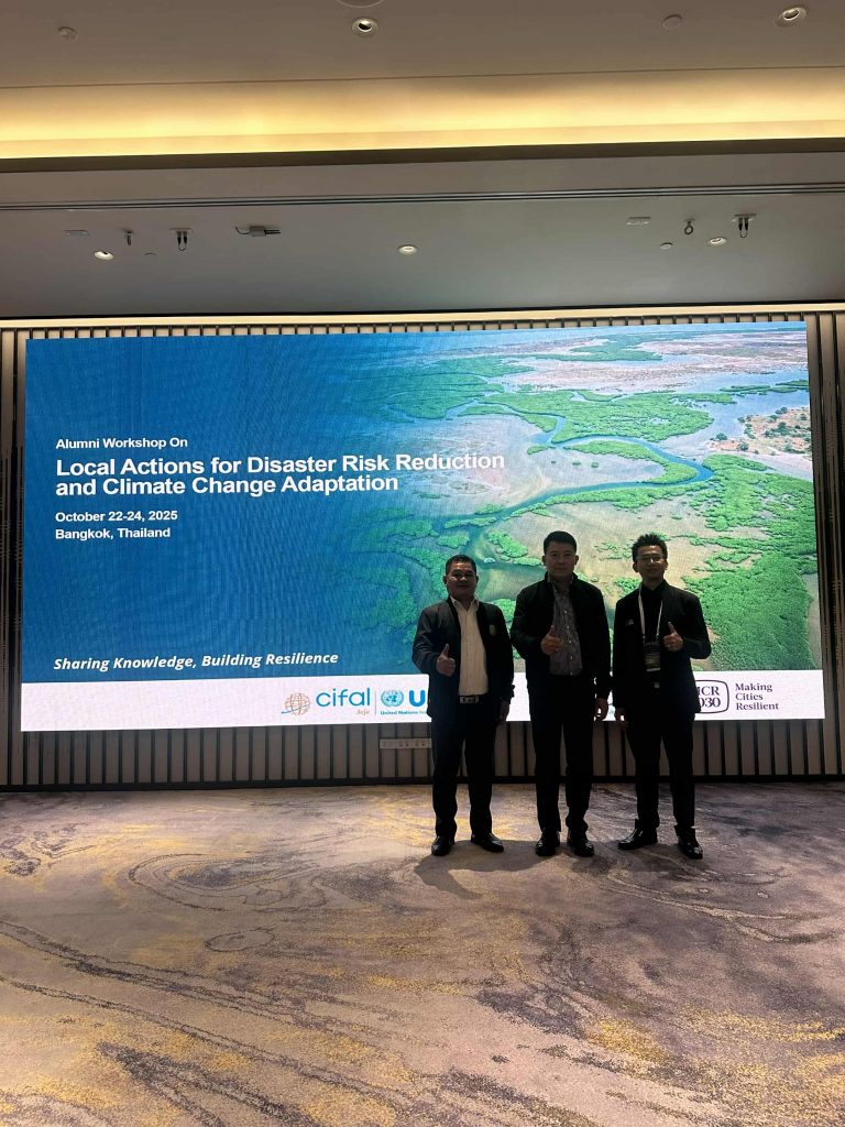 เมื่อวันที่ 22–24 ตุลาคม 2568 ณ กรุงเทพมหานคร ดร.ธายุกร พระบำรุง ผู้อำนวยการหน่วยปฏิบัติการวิจัยการเปลี่ยนแปลงสภาพภูมิอากาศ การบรรเทา และการปรับตัว (CMARE) คณะสิ่งแวดล้อมและทรัพยากรศาสตร์ มหาวิทยาลัยมหาสารคาม พร้อมด้วย จ.อ.วันชัย ชัยจริยาวัตร รองปลัด และ จ.อ.สันติ ระวังภัย นักป้องกันและบรรเทาสาธารณภัยชำนาญการ ผู้แทนเทศบาลเมืองมหาสารคาม ได้เข้าร่วมการอบรมเชิงปฏิบัติการระดับนานาชาติ “Alumni Workshop on Local Actions for Disaster Risk Reduction and Climate Change Adaptation” จัดโดย UNITAR CIFAL Jeju ร่วมกับ UNDRR (United Nations Office for Disaster Risk Reduction)