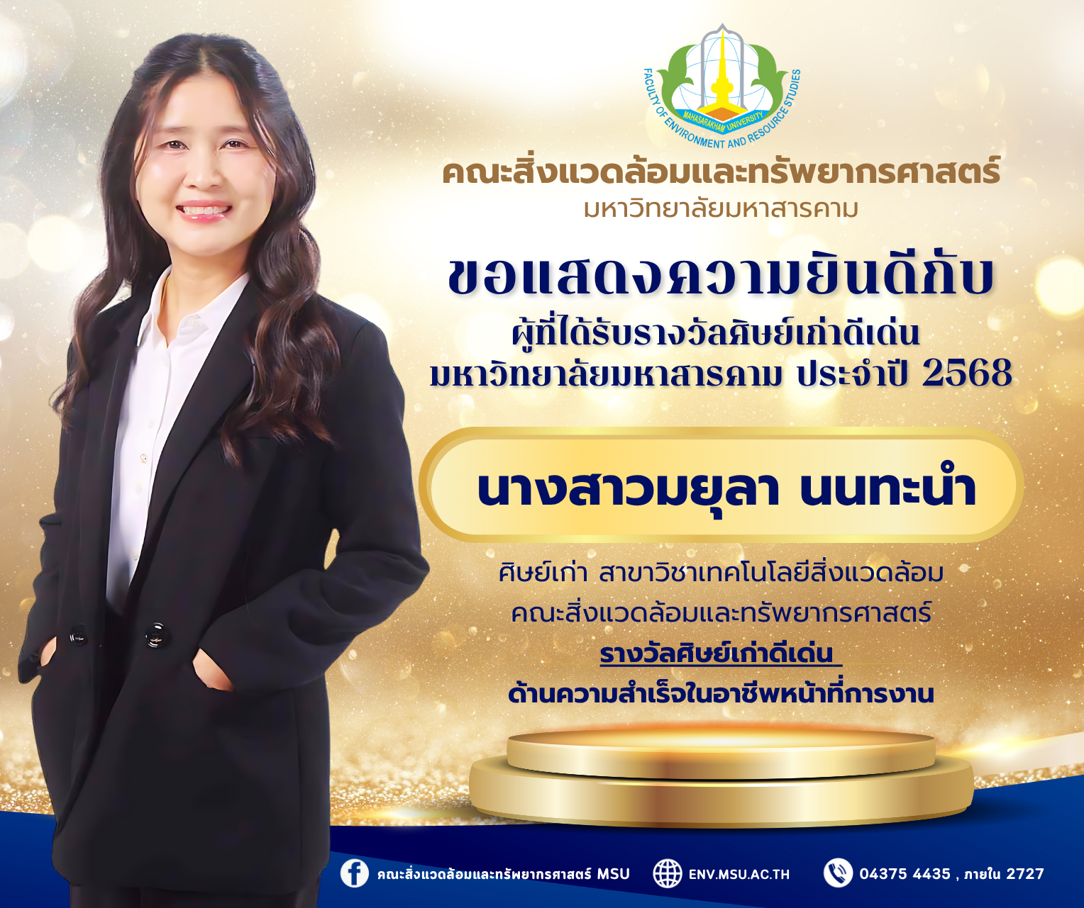 คณะสิ่งแวดล้อมและทรัพยากรศาสตร์ มมส ขอแสดงความยินดีกับ นางสาวมยุลา นนทะนำ ศิษย์เก่าสาขาวิชาเทคโนโลยีสิ่งแวดล้อม คณะสิ่งแวดล้อมและทรัพยากรศาสตร์ ที่ได้รับรางวัล ศิษย์เก่าดีเด่น มหาวิทยาลัยมหาสารคาม ประจำปี 2568 รางวัลศิษย์เก่าดีเด่น ด้านความสำเร็จในอาชีพหน้าที่การงาน