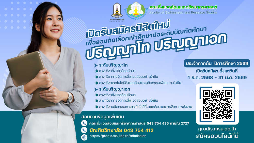 คณะสิ่งแวดล้อมและทรัพยากรศาสตร์ มหาวิทยาลัยมหาสารคาม เปิดรับสมัครนิสิตใหม่ระดับ บัณฑิตศึกษา ป.บัณฑิตชั้นสูง | ปริญญาโท | ปริญญาเอก ประจำภาคต้น ปีการศึกษา 2569 สมัครได้ตั้งแต่วันที่ 1 ธ.ค. 2568 – 31 ม.ค. 2569