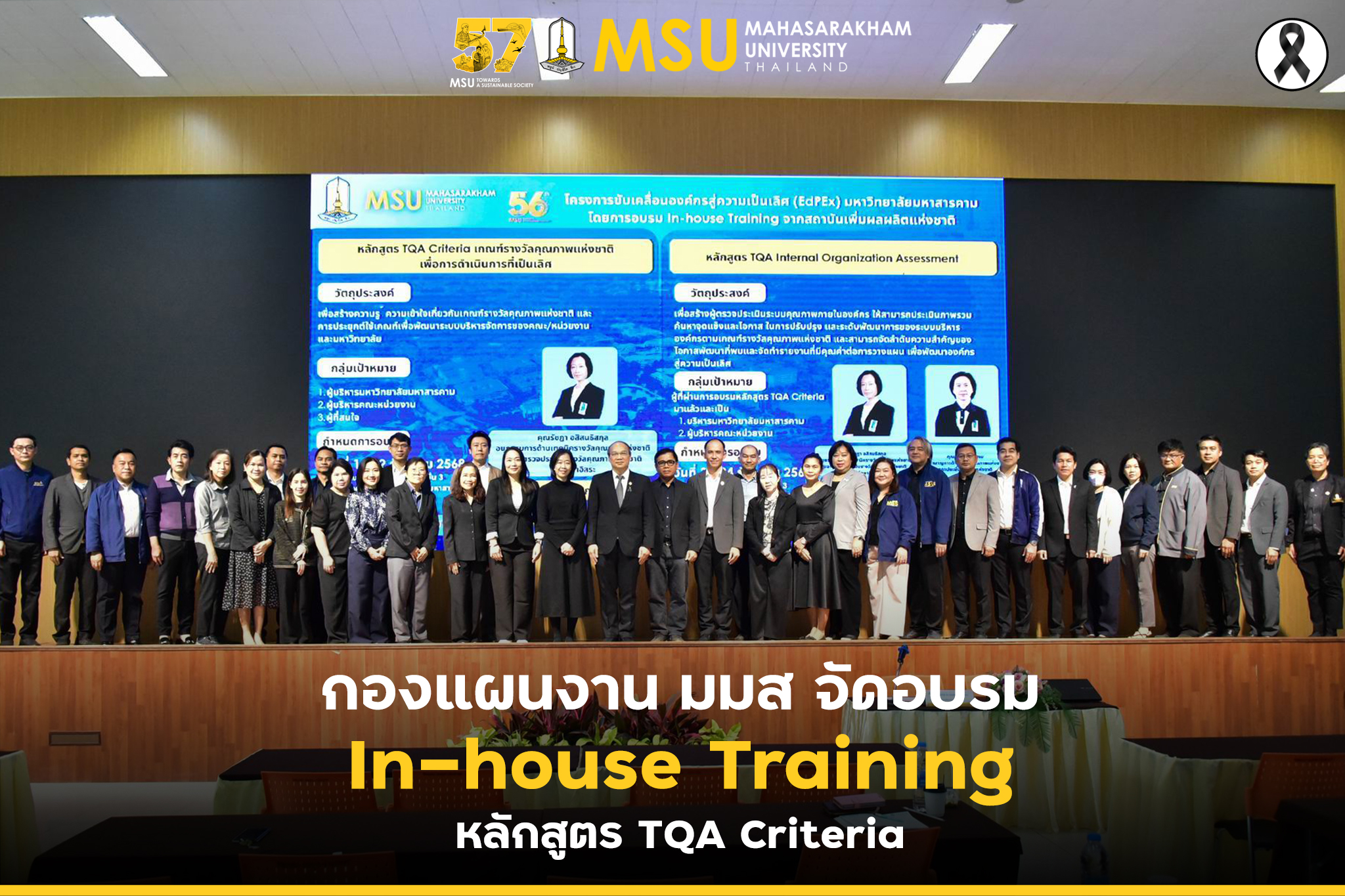 กองแผนงาน มมส จัด อบรม In-house Training หลักสูตร TQA Criteriaวันนี้ (11 ธันวาคม 2568) กองแผนงาน มหาวิทยาลัยมหาสารคาม จัด โครงการขับเคลื่อนองค์กรสู่ความเป็นเลิศ (EdPEx) มหาวิทยาลัยมหาสารคาม โดยการอบรม In-house Training จำนวน 2 หลักสูตร เพื่อพัฒนาองค์กรให้มีสมรรถนะสูงและสามารถบริหารจัดการได้อย่างเป็นเลิศตามมาตรฐานสากล เพื่อสนับสนุนวิสัยทัศน์การเป็นมหาวิทยาลัยชั้นนาของเอเชีย โครงการขับเคลื่อนองค์กรสู่ความเป็นเลิศ (EdPEx) มหาวิทยาลัยมหาสารคาม โดยการอบรม In-house Training จำนวน 2 หลักสูตร ได้แก่ หลักสูตร TQA Criteria เกณฑ์รางวัลคุณภาพแห่งชาติเพื่อการดำเนินการที่เป็นเลิศ อบรมในวันที่ 11-12 ธันวาคม 2568 และ หลักสูตร TQA Internal Organization Assessment ดำเนินการอบรม ในวันที่ 22-24 ธันวาคม 2568