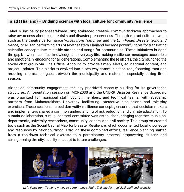 การดำเนินงานดังกล่าว ได้รับการบันทึกเป็นหนึ่งในกรณีศึกษาในเอกสาร Pathways to Resilience: Stories from MCR2030 Cities (January 2026) ภายใต้กรอบของ UNDRR สะท้อนบทบาทของมหาวิทยาลัยในฐานะกลไกวิชาการที่เชื่อมองค์ความรู้สู่การปฏิบัติ ดาวน์โหลดได้ที่ https://mcr2030.undrr.org/media/114238/download?startDownload=20260226 คณะสิ่งแวดล้อมฯ ยืนยันว่า การสื่อสารภัยพิบัติในยุคความเสี่ยงซ้อน ต้องอาศัยการบูรณาการข้ามศาสตร์ เพื่อเปลี่ยนความตระหนักให้เป็นความพร้อม และเปลี่ยนการรับรู้ ให้เป็นการลงมือทำ เมื่อภัยไม่รอให้เราเตรียมพร้อม การบูรณาการ คือ คำตอบของเมืองในอนาคต