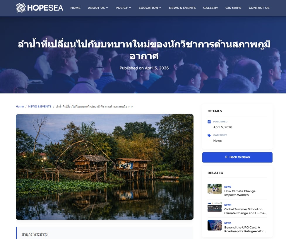 ผลงานบทความเรื่อง “ลำน้ำที่เปลี่ยนไปกับบทบาทใหม่ของนักวิชาการด้านภูมิอากาศ” โดยหน่วยปฏิบัติการวิจัยการเปลี่ยนแปลงสภาพภูมิอากาศ การบรรเทา และการปรับตัว (CMARE) ได้รับการคัดเลือกและเผยแพร่ผ่านเวที HOPE SEA (HOPE in Southeast Asia) ซึ่งเป็นแพลตฟอร์มระดับภูมิภาคที่มุ่งส่งเสริมการสื่อสารองค์ความรู้ด้านการเปลี่ยนแปลงสภาพภูมิอากาศ การปรับตัว และการสร้างความยืดหยุ่นของชุมชนในภูมิภาคเอเชียตะวันออกเฉียงใต้